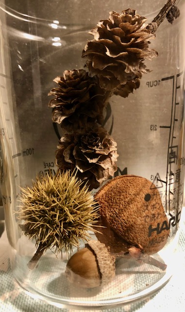 先日 いち早く秋を感じようと森へ 松ぼっくり・どんぐり・イガグリなどを拾い空瓶に入れて飾っています 木の実はいつの間にか緑色から茶色に変化していました 自然の力ってすばらしい! 自然の色が体にも沁み渡りコウヨウしています